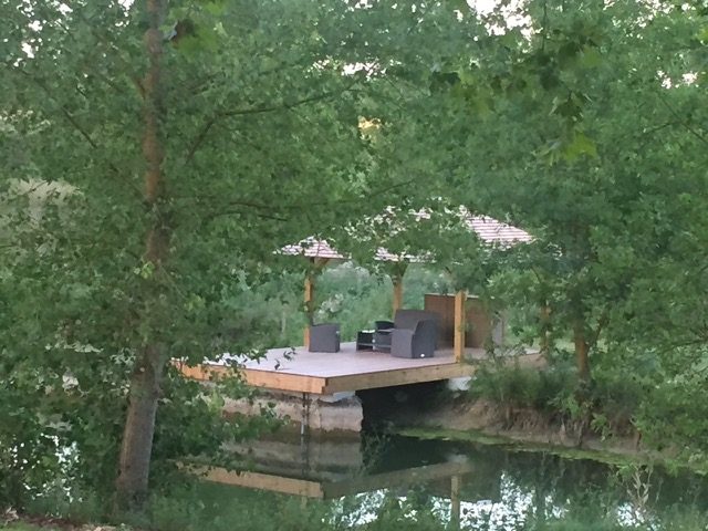 L’étang et sa terrasse abritée, le grand deck sous les platanes centenaires, les terres du domaine et